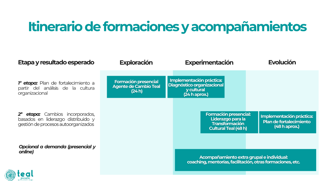 • Liderazgo para la Transformación Cultural Teal: 48 horas de formación + 48 horas aprox. de trabajo individual y en equipo.